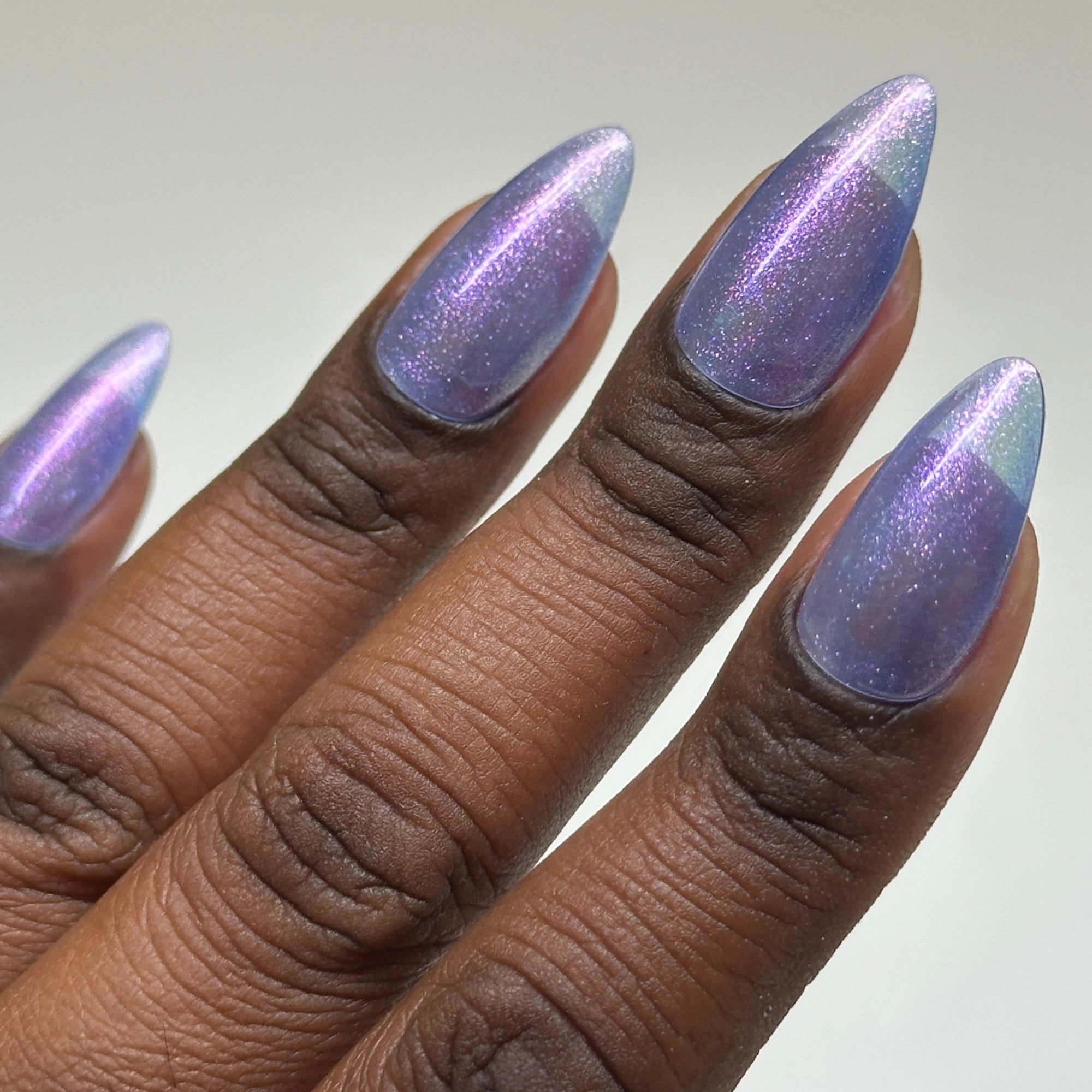 A mesmerising blue based gel with cool purple undertones, featuring sparkly pink and purple glitter reflects. Gorgeous on its own or as a topper over other gel colours.